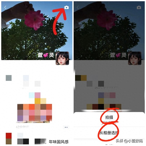 首先来到朋友圈的界面,点击一下右上角的相机图标,就会跳出两个选项,第一个是拍摄也就是实时拍摄照片或者视频,第二个就是选取之前拍摄好保存在图库中的视频或者图片,这个就根据个人需求选择,如果选择拍摄,点击进入,点击一下快门键就拍摄下来一张图片,如果想要录制视频,就要长按这个快门键拍摄下来的才是视频。