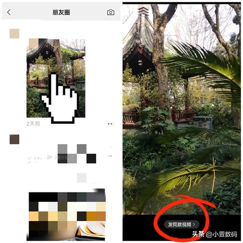 接着就是在朋友圈如何制作同款视频,平常我们会刷朋友圈,会看到各种形形色色的视频图片,如果你在朋友圈刷到朋友发的视频,很喜欢他的视频的背景音乐以及风格,也想发表和他的同款视频,就可以点击视频进去,下方有个发同款视频功能。