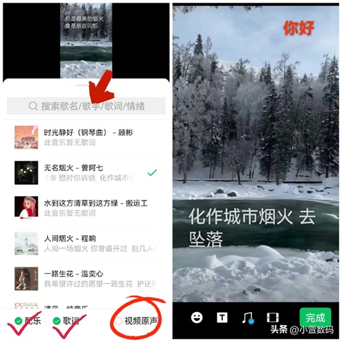 第三个就是添加音乐,点击音乐图标,你可以在上端搜索框,搜索自己喜欢的歌曲,也可以选择页面默认的音乐,点击一下,那么就添加好音乐了,为了声音更好听,还可以把原视频嘈杂的声音给她关闭,留下配乐,甚至你想要歌词显示在视频里,就可以勾选歌词,那么在视频里歌词就显示出来了。