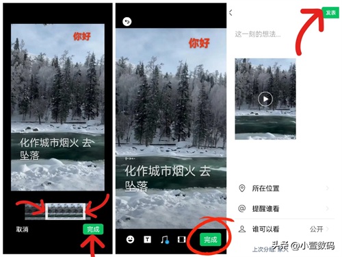 最后点击完成,点击发表就可以发布到朋友圈了,如果想要保存下来,那就在发表的朋友圈页面,长按自己刚发表的视频就可以点击保存视频到手机图库中了。