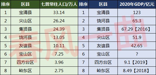 饶河县常住人口为13.05万人,友谊县常住人口为10.11万人,与第六次人口普查相比,饶河县减少1.91万人,友谊县减少0.97万人。饶河县是一个边境县,境内旅游资源丰富,经济较为发达,2020年全县GDP为65.3亿元,仅次于宝清县,是双鸭山第二经济强县,具有不小的发展潜力。