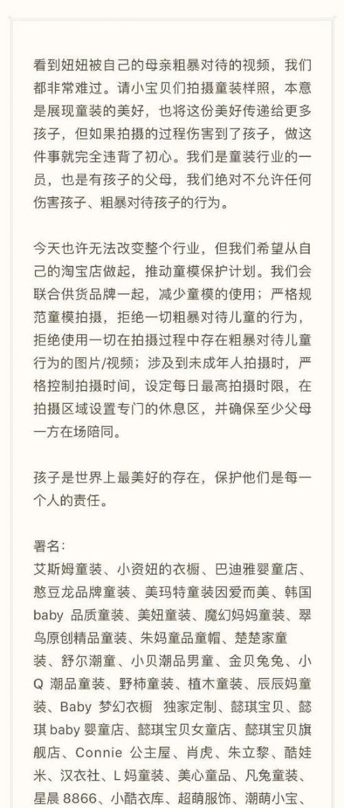 而在平台层面,淘宝已经发表声明称:针对这件事,针对童模拍摄过程中粗暴对待儿童的行为,淘宝商家已经联名表明态度,呼吁规范行业,并且从淘宝店做起,拒绝一切拍摄过程中有粗暴对待儿童行为的图片视频,呼吁童模保护计划等等。淘宝公开支持了商家的呼吁和行动,并通过官微表态,将严格按照法律法规,坚决对侵犯未成年人合法权益、伤害未成年人的行为说不。