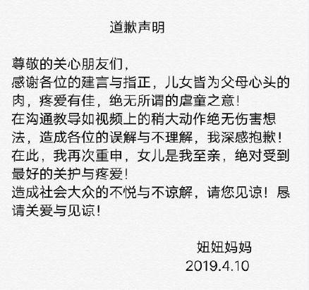 在事情发生之后,妞妞母亲随即发表了道歉信表示自己是在沟通上面有比较大的动作,但是绝对没有虐童的意思!