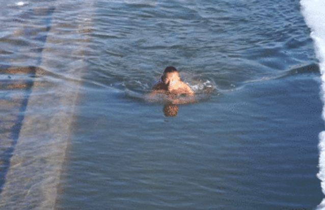 每天坚持着去大凌河冬泳,无论过年还是什么日子,只要没有活儿,从来没有缺席过。独自在大凌河的冰中开采一块冬泳天地。冬泳是他的爱好,包括身材大家有目共睹。