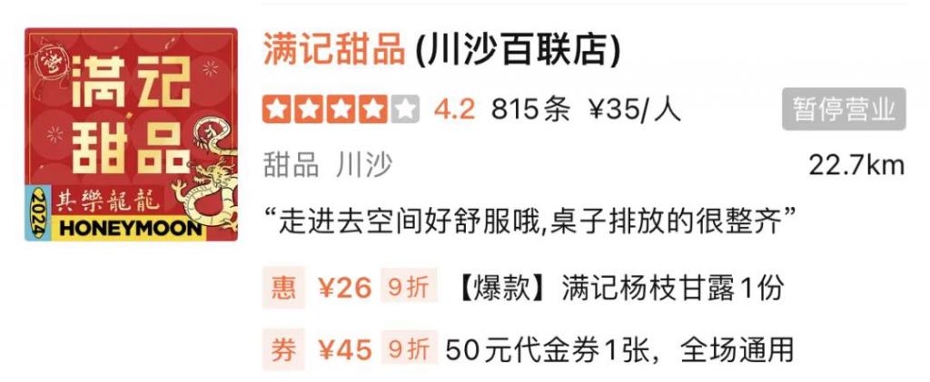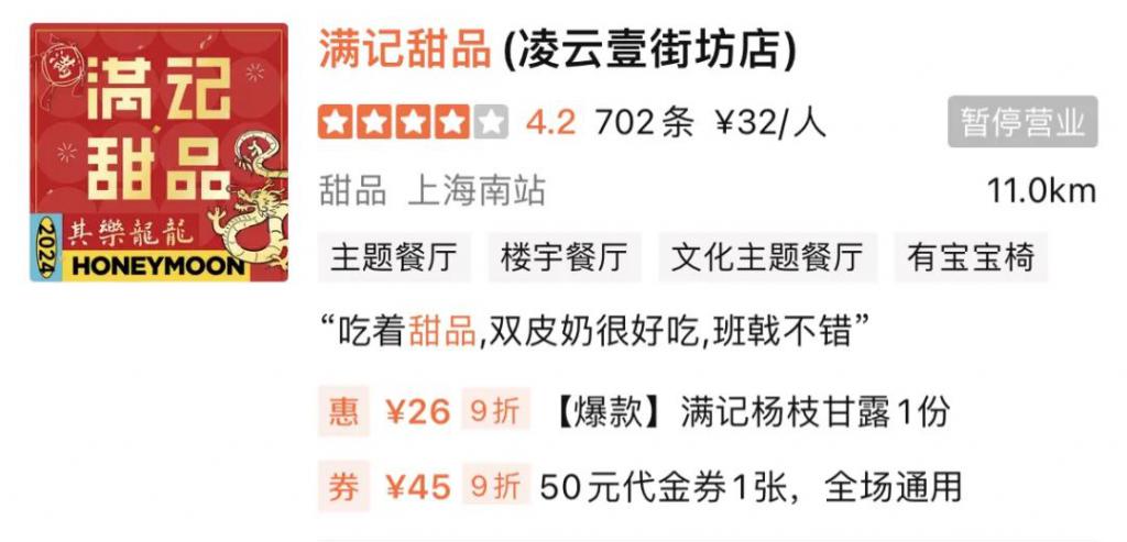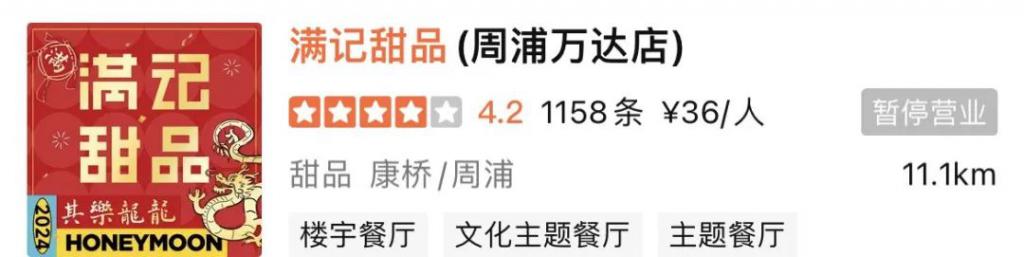 今天(3 月 17 日),记者在大众点评搜索 " 满记甜品 " 可以发现,上海门店超 40 家,其中川沙百联店、周浦万达店和凌云壹街坊店显示" 暂停营业 "。