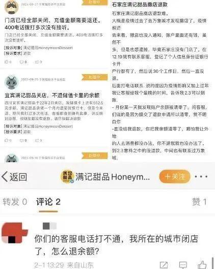 此外,在满记甜品官方微博评论里也不乏撤店退款问题的投诉,多名相关消费者反映,他们所在的城市闭店,需要退款,但 " 客服电话打不通 "。