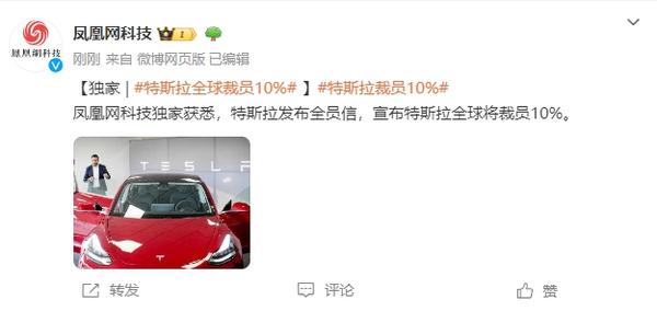 【CNMO 科技消息】4 月 15 日,CNMO 了解到,据凤凰网科技报道,特斯拉发布全员信,宣布特斯拉全球将裁员 10%。