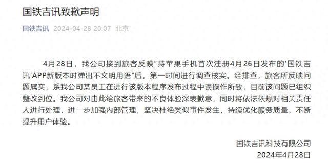 4 月 28 日晚,国铁吉讯发布致歉声明称,公司接到旅客反映 " 持苹果手机首次注册 4 月 26 日发布的‘国铁吉讯’ APP 新版本时弹出不文明用语 " 后,第一时间进行调查核实。经排查,旅客所反映问题属实,系该公司某员工在进行该版本程序发布过程中误操作所致,目前该问题已组织整改到位。