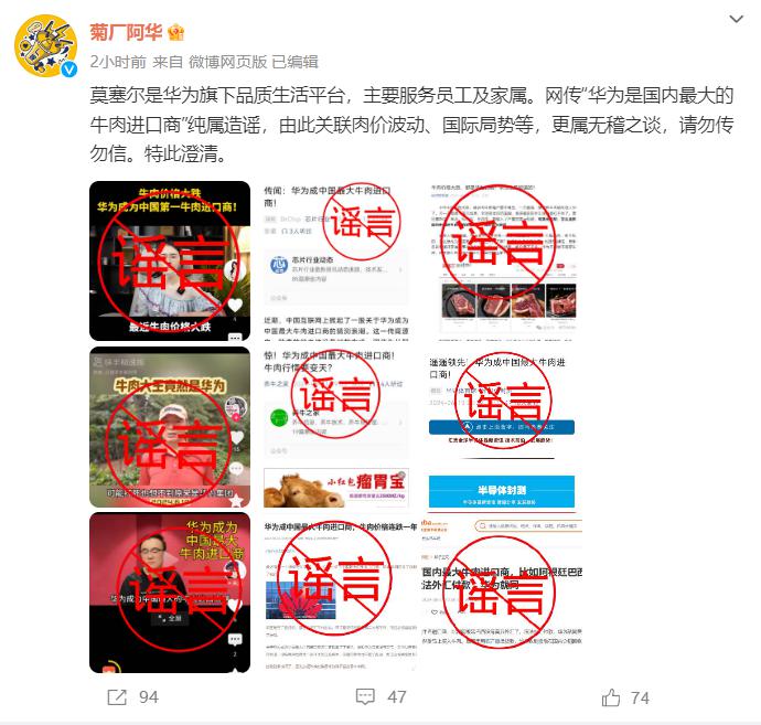 6 月 14 日,华为官方微博 " 菊厂阿华 " 发布澄清声明:网传 " 华为是国内最大的牛肉进口商 " 纯属造谣,由此关联肉价波动、国际局势等,更属无稽之谈,请勿传勿信。