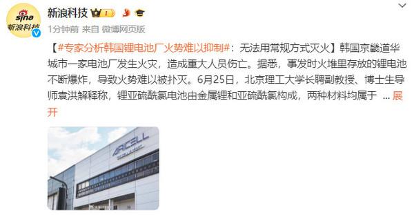 专家分析韩锂电池厂火势难抑制:无法用常规方式灭火