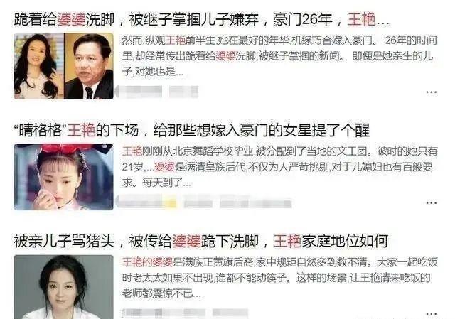 正是因为当时经过长期的封建思想,婆婆一向矜持封建,看不起王艳。王艳结婚前,老太婆不同意这门婚事,对她的演员身份很不满意,认为这不是正经的职业。儿子娶了王艳这么多年,婆婆都没有正眼看她几眼。