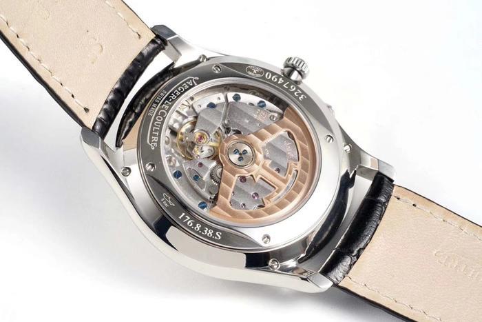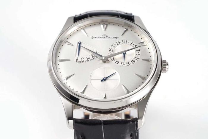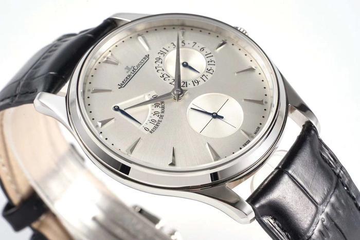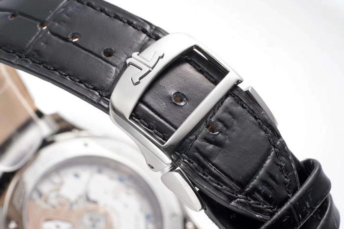 表带搭载是黑色牛皮材质,压有鳄鱼纹路,也可以自己更换鳄鱼皮带,当然ZF厂也赠送一副柔韧舒适的防汗表带——正面采用意大利小牛皮,背面则是天然橡胶,完美缝合。防汗抑菌,使用寿命远大于传统表带,长期佩戴极为舒爽!表扣方面就是普通的精钢折叠扣,打磨细腻,刻字镜面,扣面上还有积家的logo!