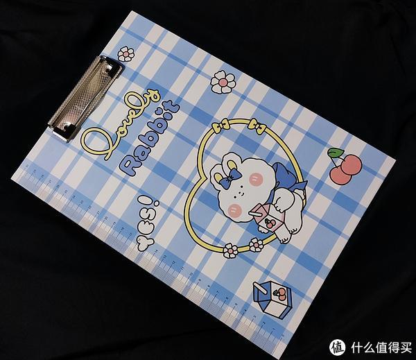这是一款A4尺寸的写字板,尺寸大,用途广。胖嘟嘟的草莓兔正坐在“心”形秋千上喝着果味饮料,好幸福的模样。卡通图案印刷清洗,色彩明亮又清新。