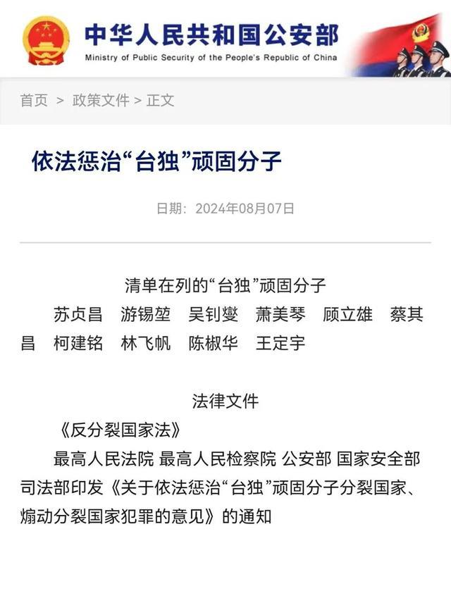 8 月 7 日,记者注意到,国务院台办网站新增了 " 依法惩治‘台独’顽固分子 " 专栏。公安部政府网站也新增了 " 依法惩治‘台独’顽固分子 " 专栏。
