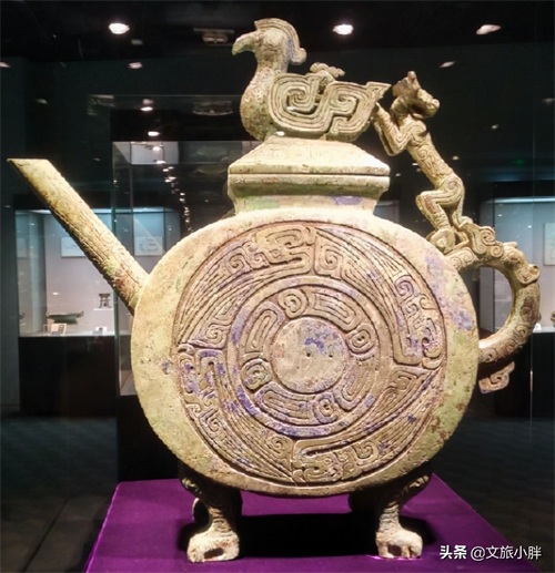 商周贵族行“沃盥之礼”,也就是洗手,需要用盉从上向下浇水洗手,洗手水落入盘中;盉与盘相配构成一整套行“沃盥之礼”所必需的重要器皿。这件西周晚期铜盉的装饰十分复杂而精彩,盖纽为一只大型凤鸟,双翅上翘。凤鸟身上又有一只勾喙的小鸟,被一只回首卷尾的虎抓住,虎前后腿回环成为穿孔,通过穿钉使器盖与下方的把手相连接,上下扭运灵活,设计十分巧妙。中国保利集团公司从海外回购,现藏于北京保利艺术博物馆。此盉为极少见的扁盉,通高44.5厘米,为目前所见形体最大的古代青铜盉之一,而且工艺复杂,设计巧妙,具有很高的历史与艺术价值。