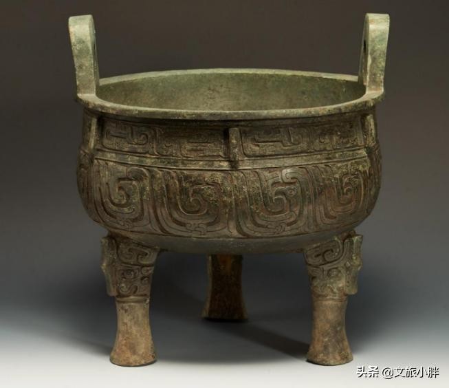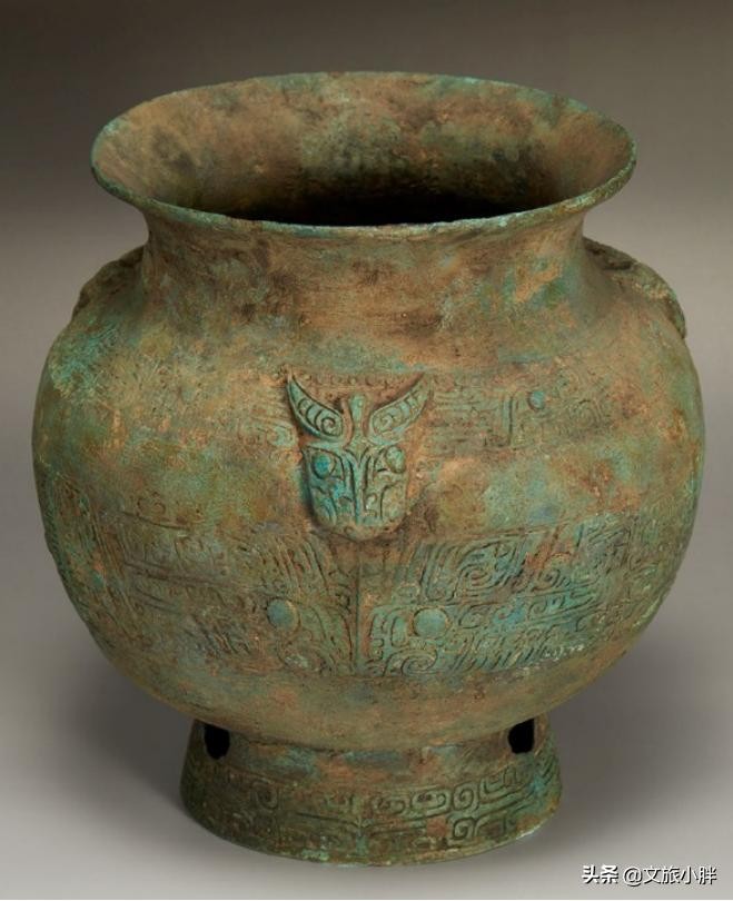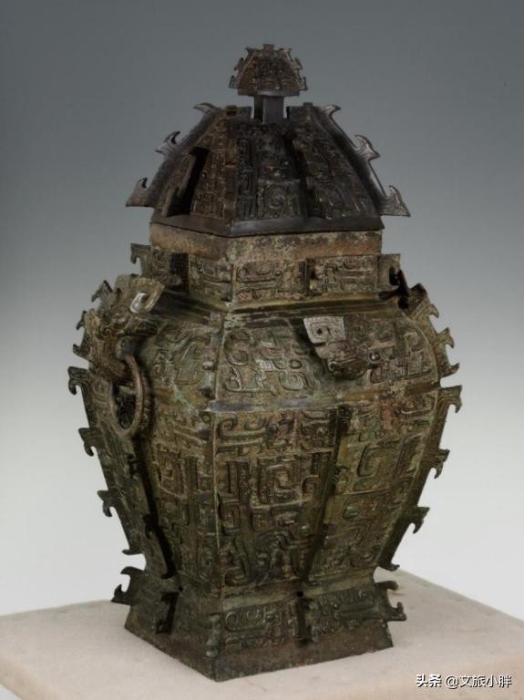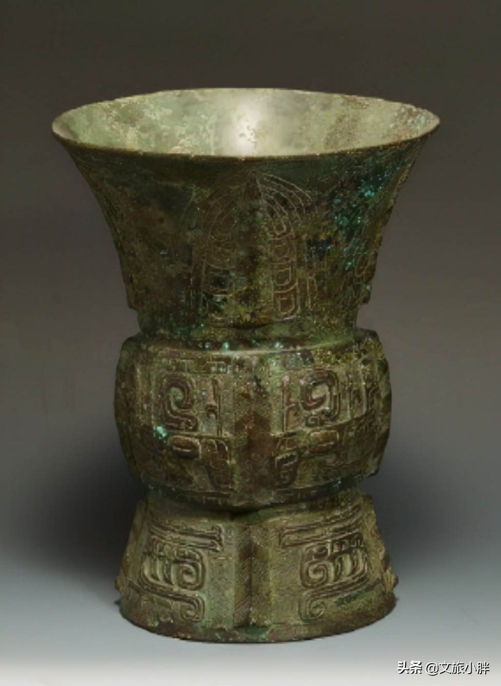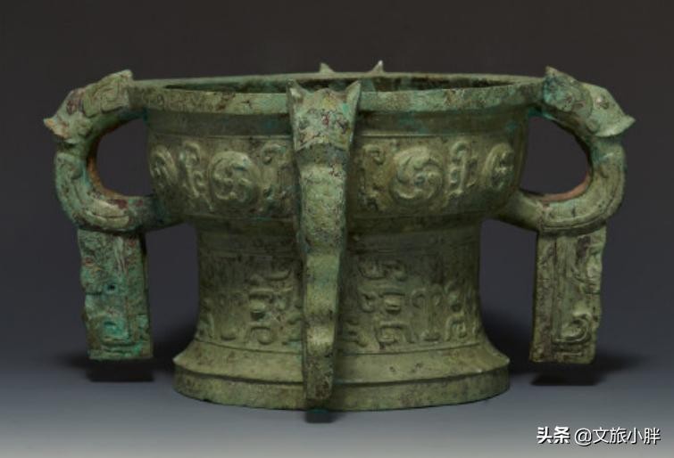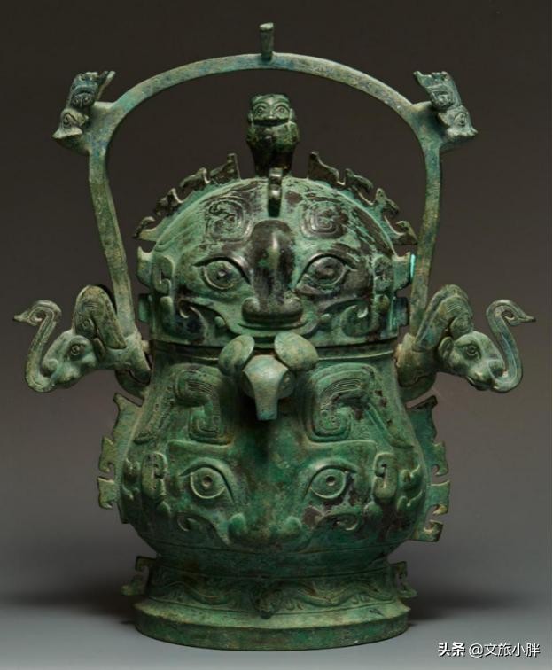尊是一种盛酒的容器,盛行于商代和西周时期,到春秋、战国的时候就渐渐消失了,按照东汉许慎《说文解字》中的解释,尊是祭祀时接待宾客所用的礼器,用于表达主人的敬意。所以“尊”又有敬重、高贵的意思。“尊重”、“尊敬”等也就变成了对人的一种敬重之词。这件商代晚期铜尊,大口外侈,中部圆鼓,下接喇叭形圈足,肩部和腹部装饰有兽面纹等花纹,肩部等距离排列三个浮雕的牛首。这件铜尊据称20世纪20年代出土于河南某地,不久即被销往欧洲,2000年保利艺术博物馆将其抢救回国,现藏于北京保利艺术博物馆。此尊形体较大,造型十分规整,展现出很高的铸造工艺水平,一直被欧洲的青铜器学者视作公元前14世纪前后中国青铜艺术的代表作之一。