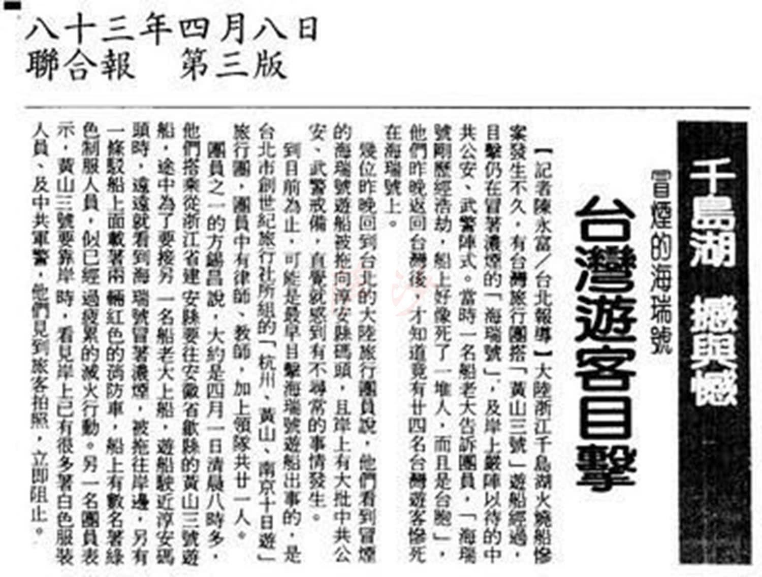 这艘满载台湾游客的“海瑞号”游船,从黄山经过千岛湖,预计当晚在淳安县茶园镇码头上岸,但离奇的事情,就在这天晚上发生。