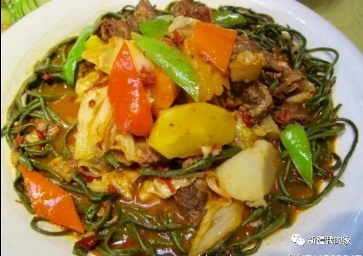 晾干的豇豆角经常作为,锡伯族美食“萨斯肯”中的配菜,这是一种传统风味的炖菜。由牛肉、土豆、白菜、干豆角、胡萝卜等食材先炒后炖的特色炖菜,最后配些青、红辣椒用以点缀。这道菜与大杂烩有异曲同工之处,菜品搭配的营养丰富,颜色亮丽。这萨斯肯是新疆锡伯族的菜,也是结合新疆特有的饮食习惯和环境衍生的菜品。
