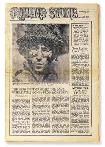 1967年10月,一本首期只有24页的刊物,以“半报纸半杂志”的形态出现在了旧金山的报摊上。令人意外的是,这位围绕着摇滚乐打转的刊物封面却选用了电影《How I Won The War》中的约翰·列侬(John Lennon)的一张剧照。