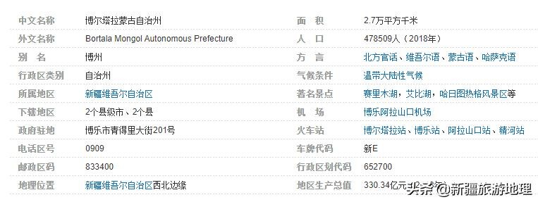 博尔塔拉蒙古自治州,简称“博州”,隶属于新疆维吾尔自治区,“博尔塔拉”系蒙古语,意为“银色的草原”,位于新疆维吾尔自治区西北边缘,地处欧亚大陆腹地,西、北、南三面环山属北温带大陆性干旱气候。总面积2.7万平方千米,辖2个县级市、2个县。2018年总人口478509人。