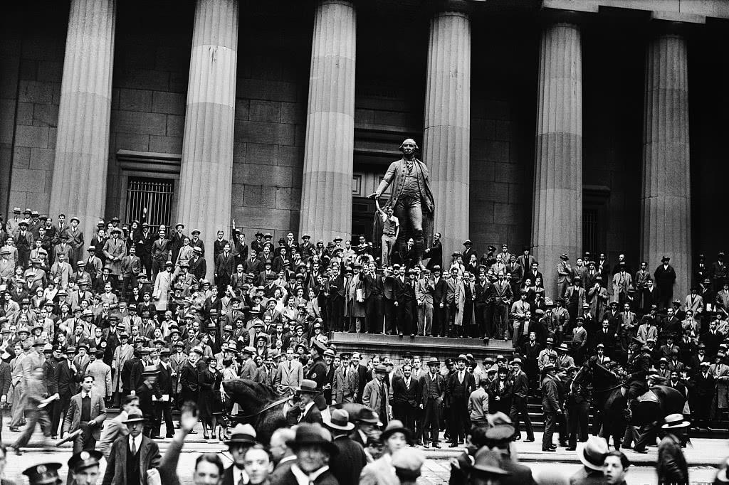 【美国股市遭遇“黑色星期四”】1929年10月19日,美国纽约市场上出现抛售股票浪潮,股票价格大幅度下跌。到10月24日(星期四),由举国上下谣言四起造成了金融不稳,人们惊恐万状,被吓坏了的投资者们命令他们的经纪人抛售股票,导致美国股市崩溃。这一天被称为“黑色星期四”。人们很难估计其具体损失。图为“黑色星期四”那天纽约街头景象。Bettmann-Corbis/视觉中国