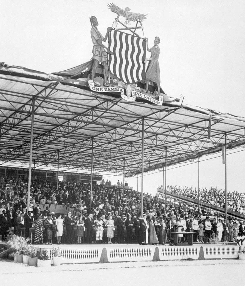 【赞比亚独立,卡翁达任首任总统】1888年,英国殖民者罗德从当地酋长取得了开矿权。同年英国当局建立了南北罗德西亚。1964年1月,北罗得西亚实行内部自治,由联合民族独立党组成“内部自治政府”,同年10月24日正式宣布独立,北罗德西亚改称为赞比亚共和国,但仍留在英联邦内,卡翁达任总统。图为赞比亚独立大会现场。Bettmann-Corbis/视觉中国