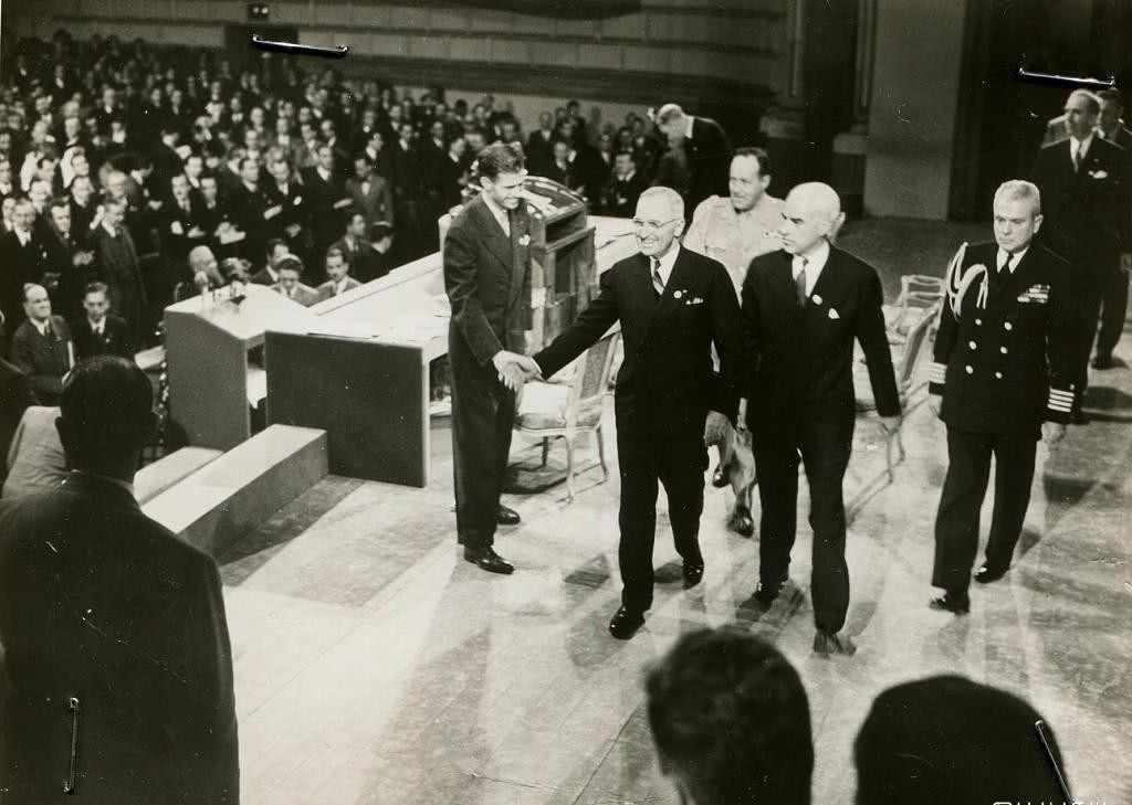 【联合国成立】1945年2月25日,在美国旧金山,由美、英、中、苏、法5国发起,50个同盟国国家的代表团参加的联合国国际组织会议隆重举行。经过两个多月的讨论,起草了《联合国宪章》。各国代表都签署了这个宪章,其后波兰也在宪章上补签。10月24日,美、英、中、苏、法等多数签字国送交了批准书,宪章开始生效,联合国正式宣告成立。图为美国总统杜鲁门出席联合国国际组织会议闭幕式。秦风老照片馆/视觉中国