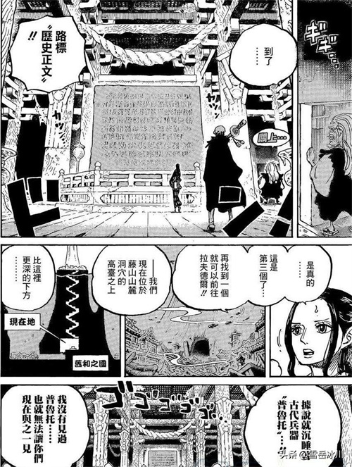 更何况在1058话已确认,冥王战舰依然存在,罗宾根据阿拉巴斯坦的历史文本得知其沉睡于和之国,而前任将军光月寿喜烧告诉她、冥王就在和之国的最深处(见下图)。总之有弗兰奇+罗宾在、并且和之国的新任将军桃之助已经挂了草帽旗,这就等于草帽团拥有了古代兵器-冥王。这一切都是尾田的伏笔,相信“冥王”会在将来第二次的顶上战争时被启动去帮助路飞。