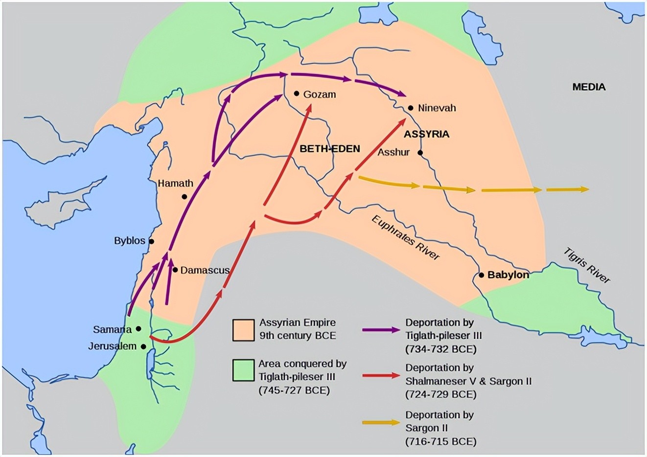 提格拉特帕拉沙尔三世的征服活动(绿色)及对以色列人的放逐。提格拉特帕拉沙尔三世以对帝国中成千上万人民的逼迁来穏固亚述的统治。
