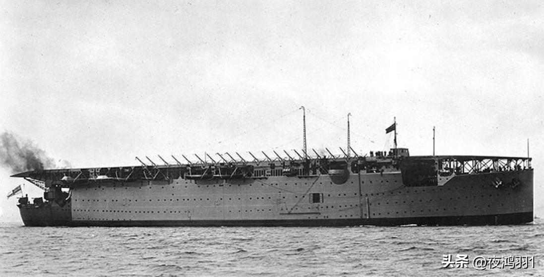 1917年6月,英国将一艘巡洋舰改装为世界上最早的暴怒号航空母舰,其载机20架,但是原巡洋舰中部的建筑未拆除,甲板分别前后两块,飞机起落既不方便又很危险。