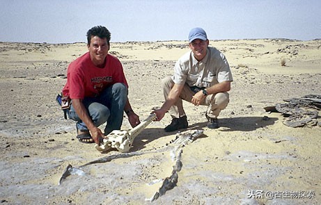 图注:塞里诺(穿红衣者)与发现的恐鳄化石,图片来自网络
