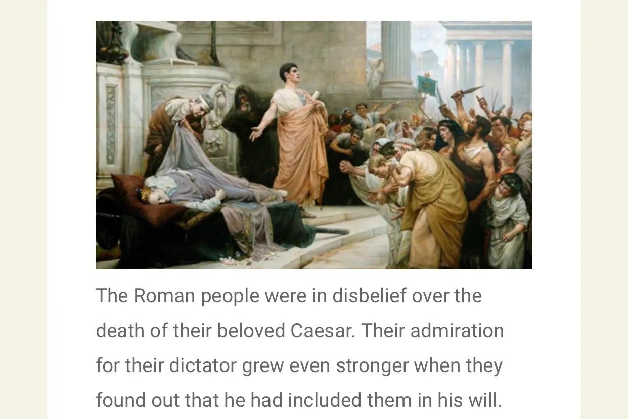 罗马人民对他们心爱的凯撒的死感到难以置信。 当他们发现独裁者将他们列入遗嘱时,他们对独裁者的钦佩更加强烈。