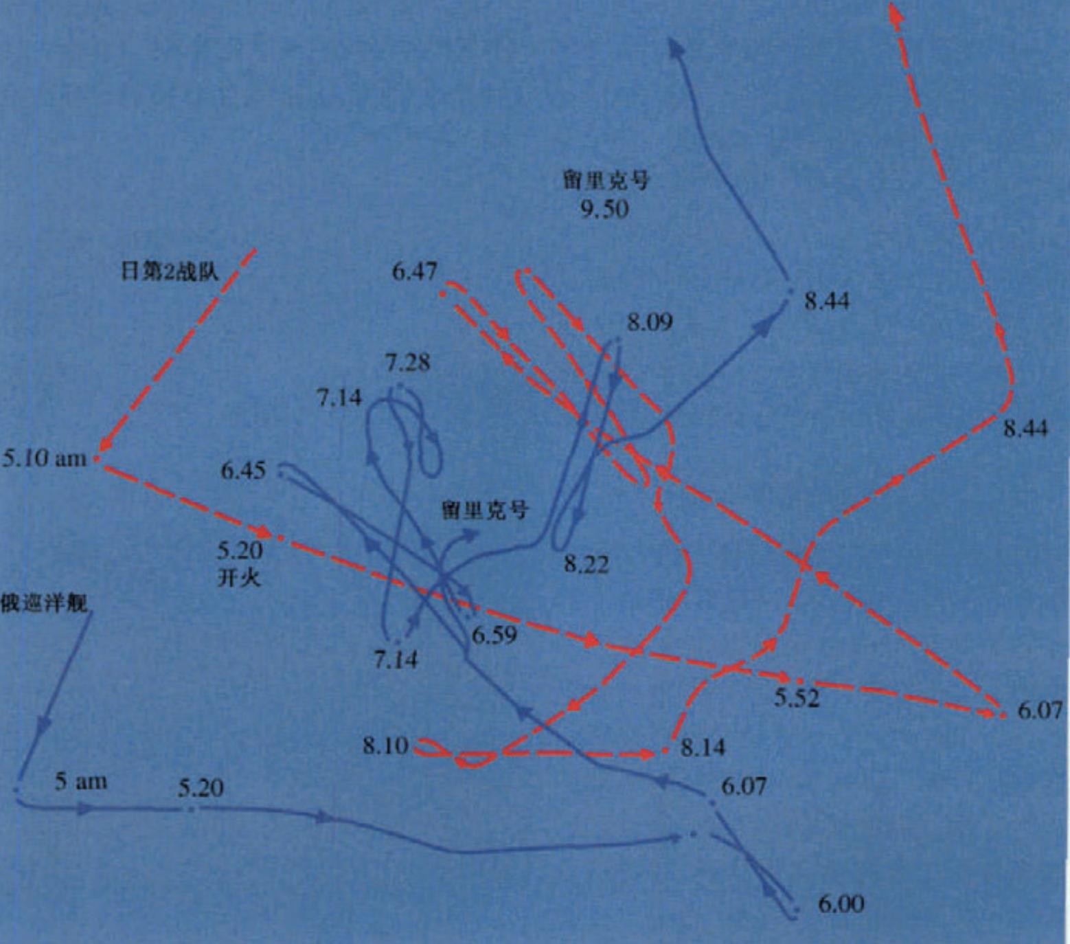 当时沙俄的远东海军舰队分成两部分,一部驻扎在旅顺,在黄海海战中被联合舰队一锅端掉了;另一部分在海参崴,主力为“俄罗斯”号、“格罗莫鲍伊”号、“留里克”号三艘装甲巡洋舰,他们并不知道旅顺港的情况。