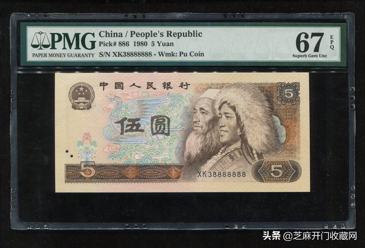 1980年第四版人民币伍圆一枚,趣味号7同8888888,PMG 67EPQ,估价: RMB 14000,成交价格: RMB 32200
