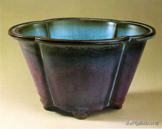花盆托呈菱花式,下承三云头足。内施天蓝色釉,釉面有蚯蚓走泥纹,外部设玫瑰紫色釉,绚丽斑斓,玫瑰红色釉和盆中的蓝色相互衬映,犹如夕阳与晚霞相辉映,给人以美丽的遐想。