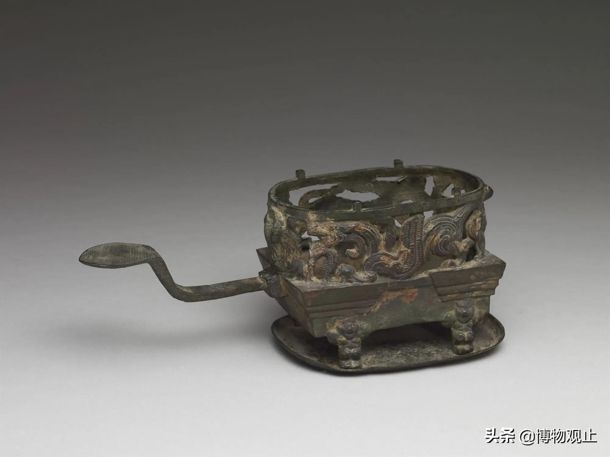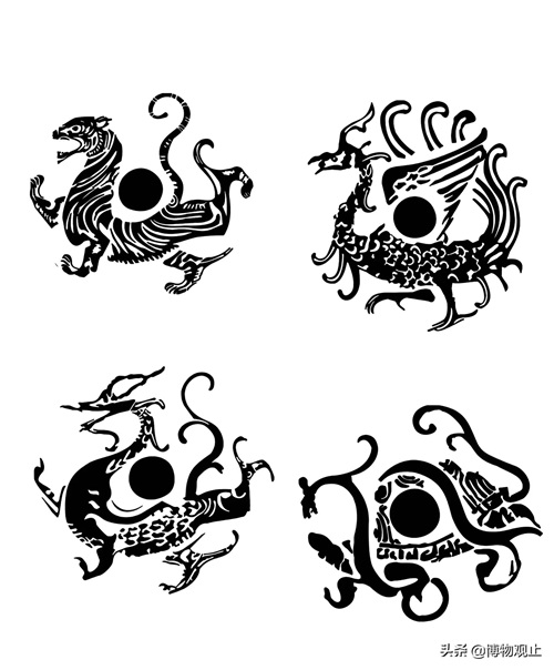 这件汉代的四神兽染炉,据说是用来温酒的食器。它的炉身上装饰有青龙、白虎、朱雀、玄武的神兽图案。图案的相对位置,说明四神和方位的配对,在汉代便已约定俗成。