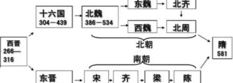 三分魏蜀吴,两晋前后延,指东汉末年各诸侯分起,相互征战,最后形成魏蜀吴三国三分格局,三国被西晋统一,西晋的八王之乱及之后的战乱导致西晋灭亡了,司马睿南渡又建立了东晋。这里插入一下,西晋灭亡后北方为十六国时期,而南方为东晋时期。