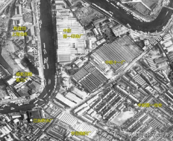 上面的航拍图中,“中纺第一印染厂”就是创办于1929年的日商内外棉株式会社所属第一、第二、第三加工场发展而来的,其中第二加工场是当时全国规模最大的印染厂,被称为远东第一,产品以“水月”“四君子”牌阴丹士林色布为著名。解放后,改称上海第一印染厂,生产品种从原来的纯棉织物发展到纯棉和涤棉混纺织物,在新中国的纺织印染发展史上留下光辉的一页。