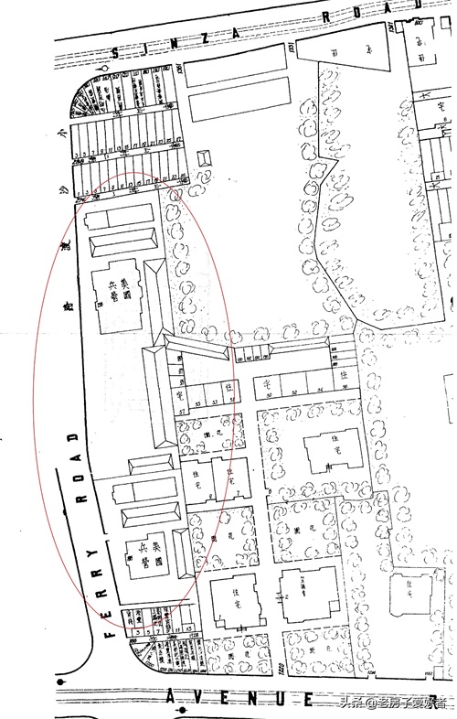 在英国汇丰银行大班住宅的对面,原小沙渡路一号,也有几幢洋房。下图是1948年航拍图,上面红色圈内的就是原小沙渡路一号建筑,下面红色圈内的是英国汇丰银行大班住宅。