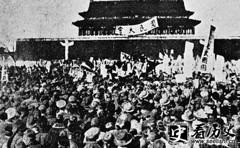 5月4日下午一时,北京大学、高等师范(北京师大的前身)、工业专门学校、农业专门学校、朝阳大学、汇文大学等十四个学校的学生三千多人纷纷来到了天安门广场。他俩手里拿着各色各样的旗子、标语牌,上面写着“取消二十一条”“还我青岛”“宁肯玉碎,勿为瓦全”等字样,有的还绘着山东的地图和各种讽刺画。