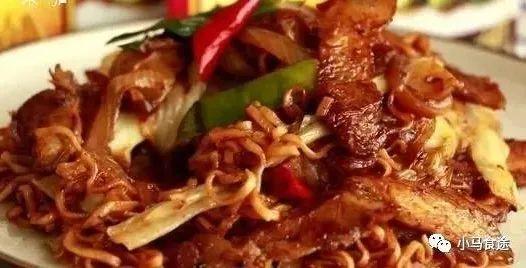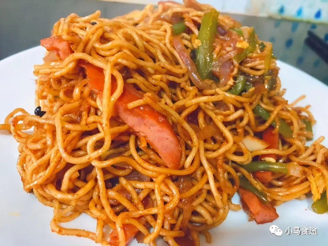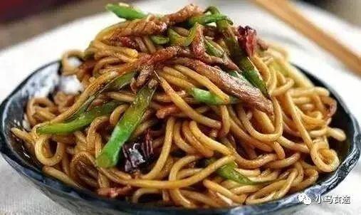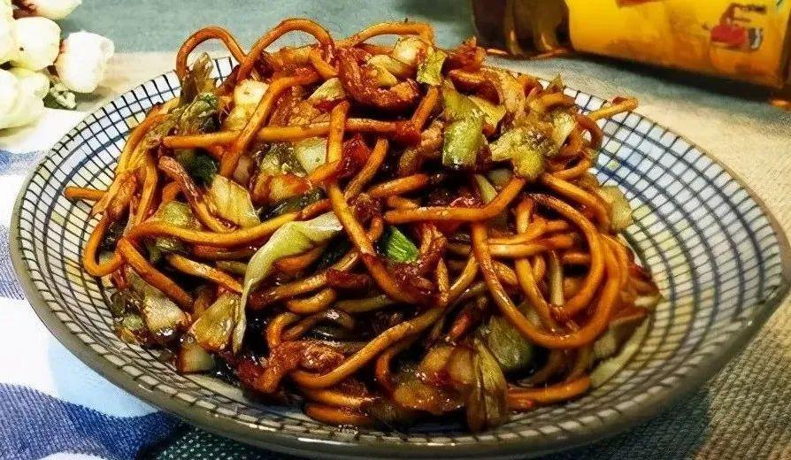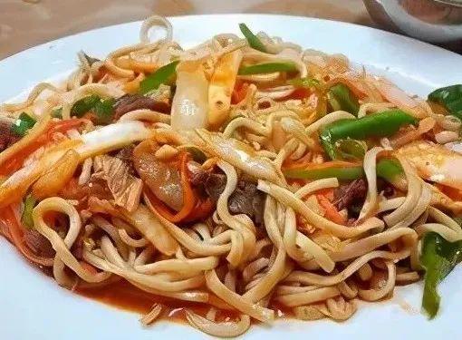 2.五花肉切细条,下入锅中炒香,加入葱姜蒜、干辣椒炒香,下入老抽、生抽翻炒上色,加入盐、花椒粉、大料粉、姜粉、辣椒粉炒出香味,下入洋葱丝、青椒丝、面条,快速翻炒均匀,加入陈醋、鸡精、味精、葱花、葱油再次翻匀即可出锅。