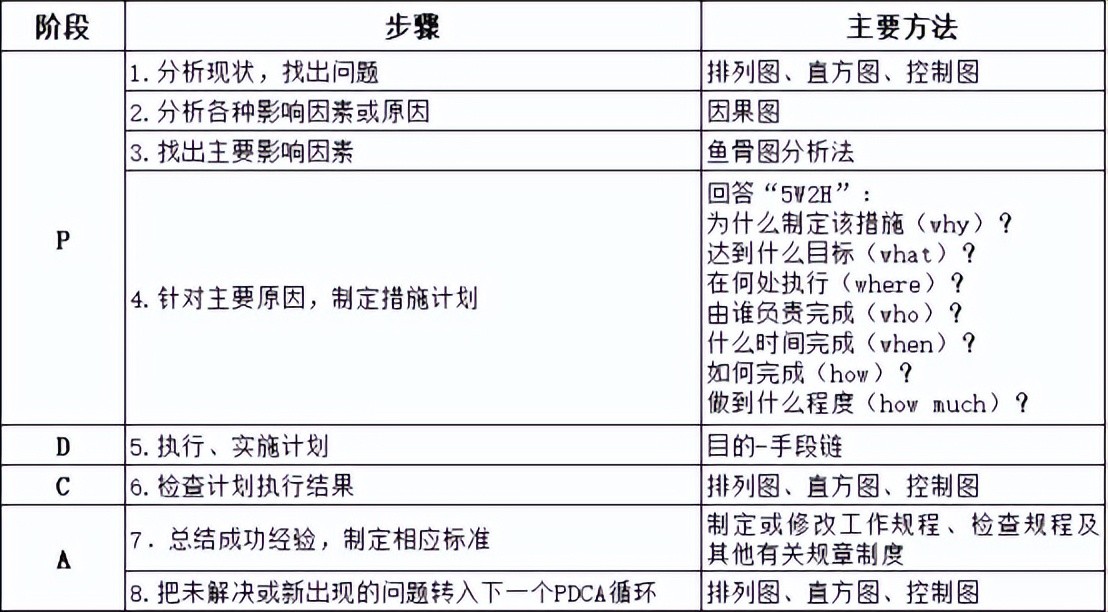 (3)科学管理方法的综合应用。PDCA循环将以质量管理七种工具为主的统计处理方法以及工业工程中工作研究的方法,作为进行工作和发现、解决问题的工具。PDCA循环的四个阶段又可细分为八个步骤,每个步骤的具体内容和所用的方法如下表所述。