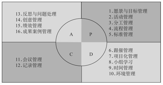 其次是D阶段的五项内容,即保证员工按照流程与标准完成各项活动,这就需要利用“小组学习”的方法,实现“从用人干工作到用工作育人”的转变。在各项工作实施过程中,保证工作效率和工作质量则需要“跟催管理”“项目化管理”“时间管理”。为了展现企业的良好形象,同时给员工提供良好的工作氛围,需要实施“环境管理”。