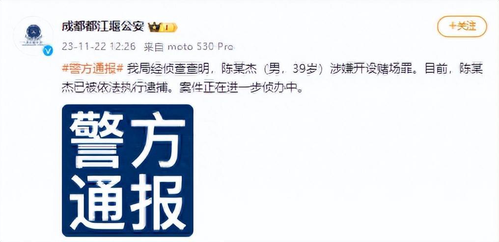 直到11月22日,成都都江堰市公安局发布了警方通报,证实了陈某杰(男,39岁)涉嫌开设赌场罪,并已被依法逮捕,这次终于有了确凿的证据。