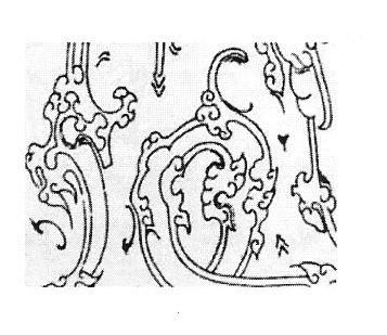 可以说,云躯这条“线”的作用是非常重要的。如果没有云躯这条“线”,商周时期的云雷纹就不可能独立出来成为春秋战国时期的勾卷纹,也不可能出现汉代的云气纹。除此之外,汉代的云气纹中也出现了双线云躯,形成了具有一定宽度的带形云躯,极大的扩大了云躯的覆盖面,将密集的线条变得有条不紊。在整体的装饰效果上,带状的云躯也起到了加强流动,造成气势的作用,将急转回荡的云气纹的气势表现的十分到位。体现了卷云纹流动磅礴的气韵。