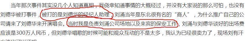 “我听到有人现场飙脏话,大约五分钟后刘涌来了不知为什么把刘德华的经纪人打了一巴掌,后台现场一片哗然,不欢而散。”
