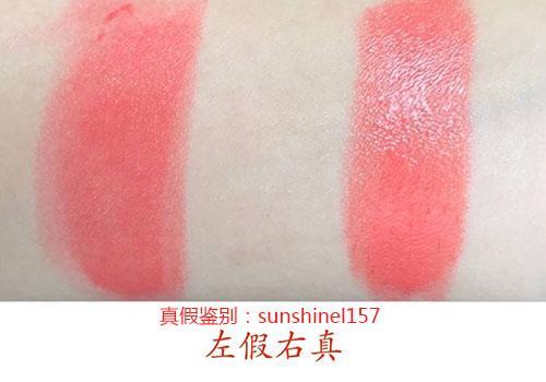 YSL圆管的滋润度非常高,在图中也可以很明显的看出正品是非常滋润的,有明显的反光。而仿冒品居然是哑光质地的,会掉屑的。