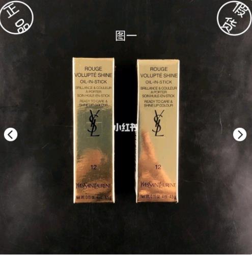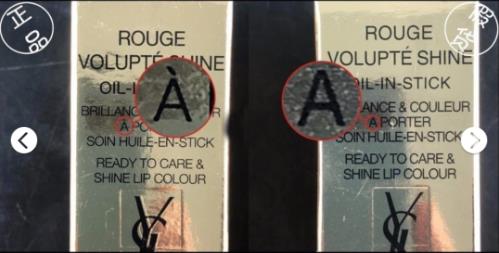 用荧光剂检测笔检测发现,假货明显含有荧光剂,正品的YSL标识不反光的,假货反光看得很清晰。