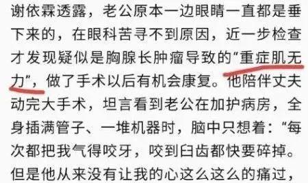 她在微博里自曝,两年前老公就曾做过手术,此后一直保持良好的生活习惯,此次复发意味着老公未来几乎无法痊愈,只能一辈子与重症肌无力共存。