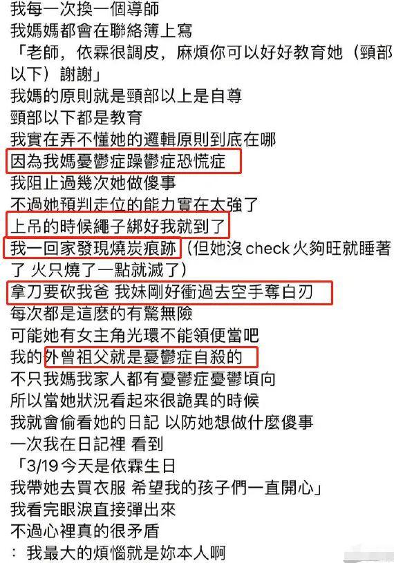 看起来乐观开朗的谢依霖,其实并没有享受到太多原生家庭带来的温暖,她曾主动提及母亲患上过三种不同的精神病:躁郁症、忧郁症和恐慌症。